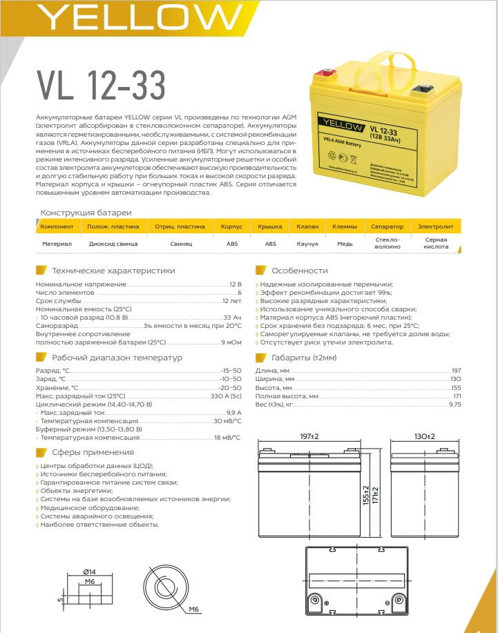 Аккумулятор Yellow VL 12-33 YL 12В 33Ач 197x130x171 мм Прямая (+-)