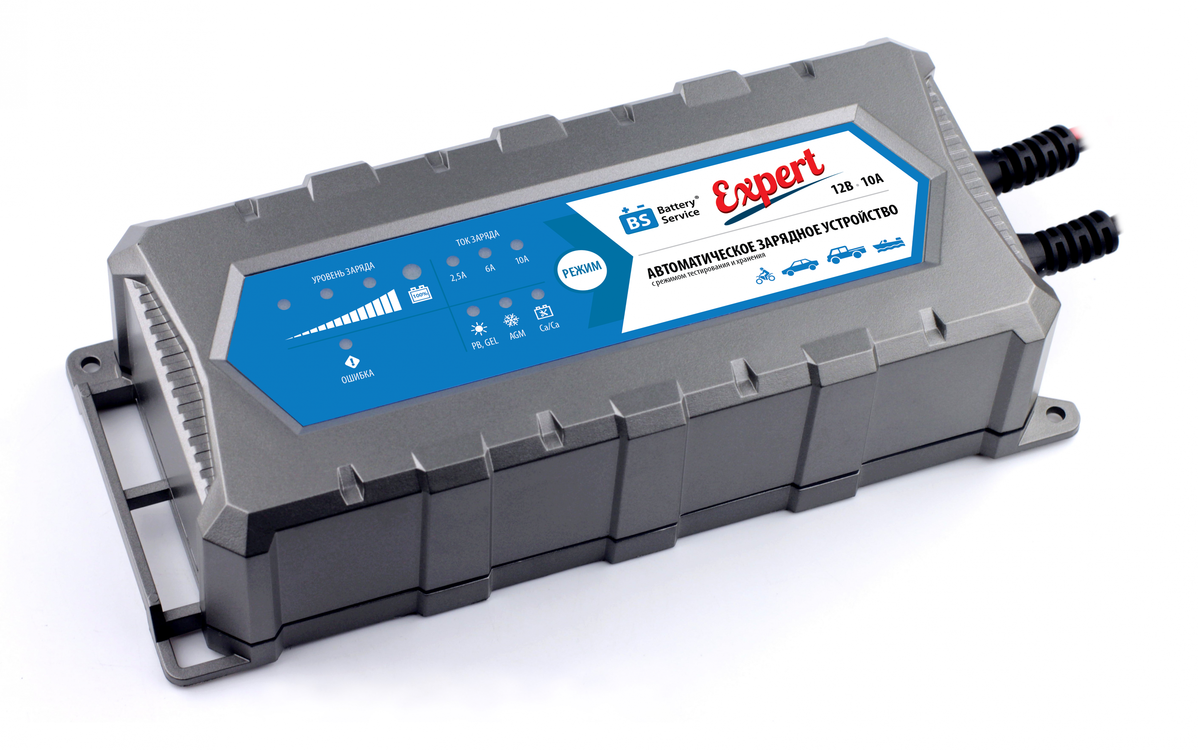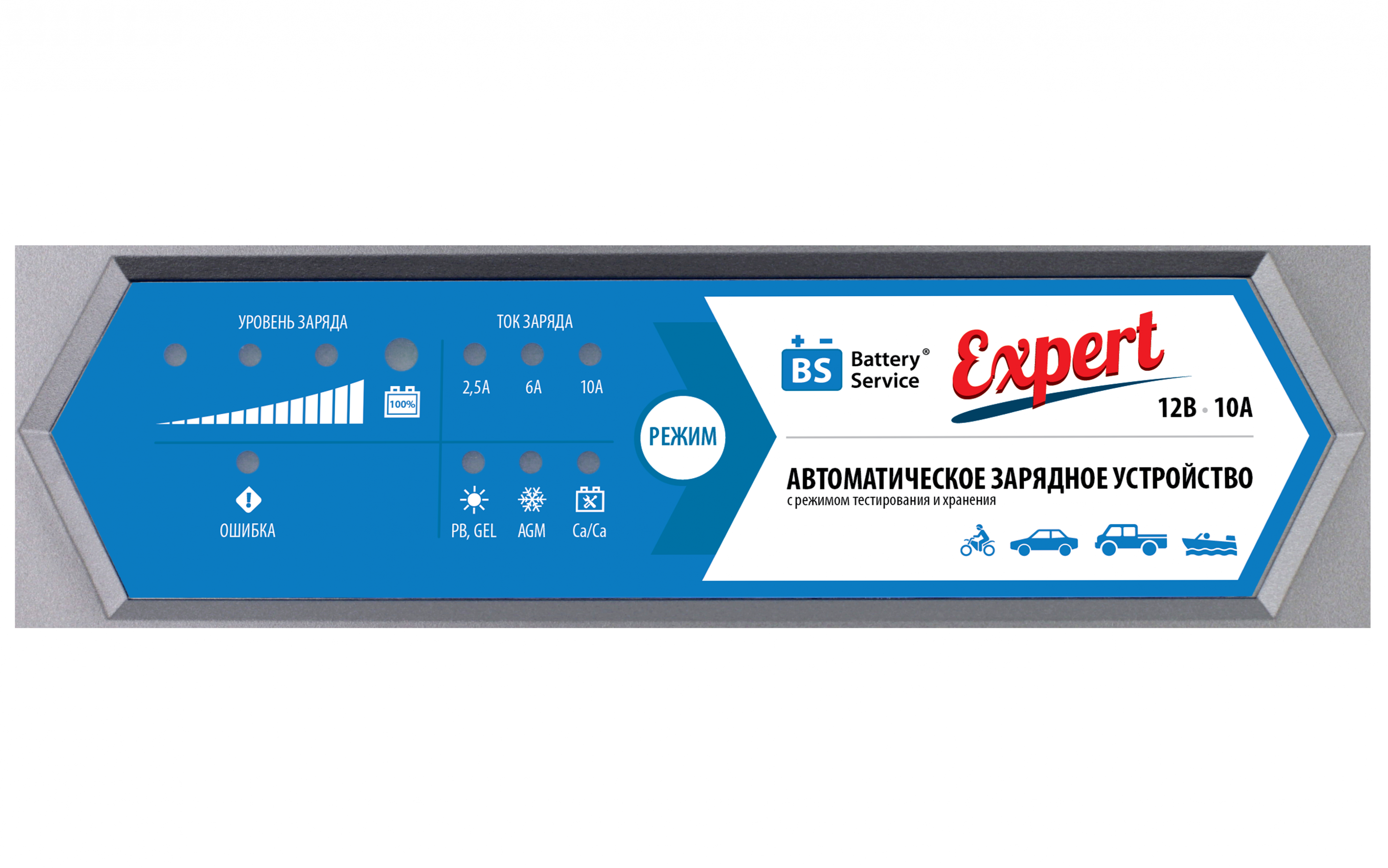- Выбор тока заряда от 2,5А до 10А покрывает практически все доступные емкости мотоциклетных, а также автомобильных и промышленных батарей до 240Ач.