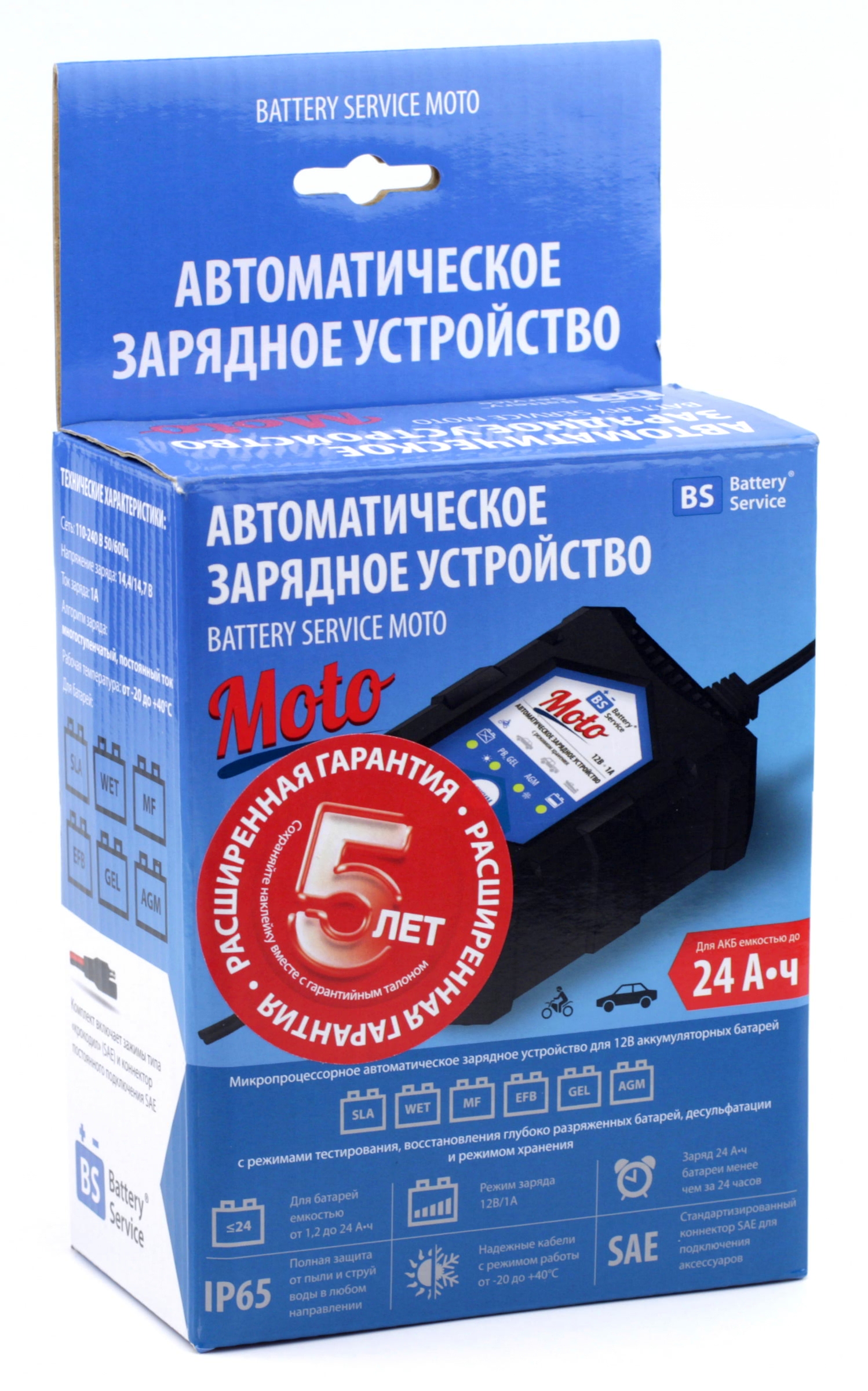 Зарядный ток 1А подойдет для всех емкостей мотоциклетных и квадроциклетных аккумуляторов, а также автомобильных аккумуляторов до 40Ач., в т.ч. для длительного хранения.Заряжает свинцово-кислотные 12В аккумуляторные батареи ёмкостью до 40 Ач любых типов: STD, WET, GEL, AGM, EFB, Ca