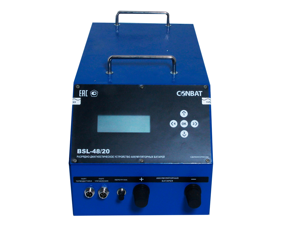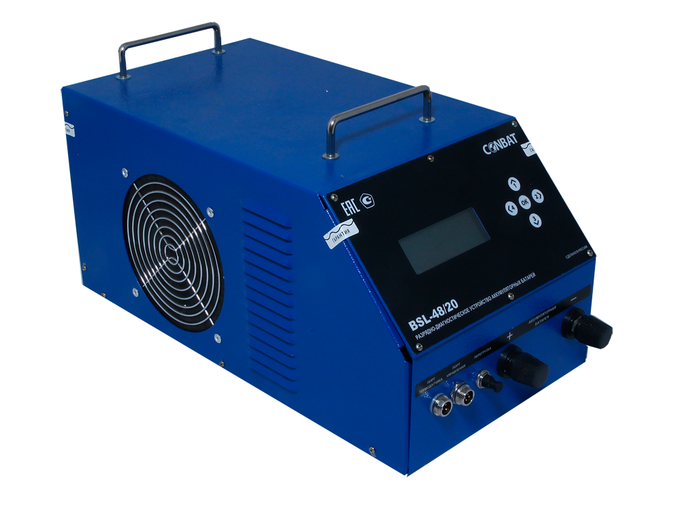 Разрядное устройство BSL-48/20 тестирует 2В, 6В и 12В аккумуляторы, а так же аккумуляторные сборки до 48В, емкостью до 400Ач (С20).Максимальный ток разряда 20А, шаг установки 0,1А.